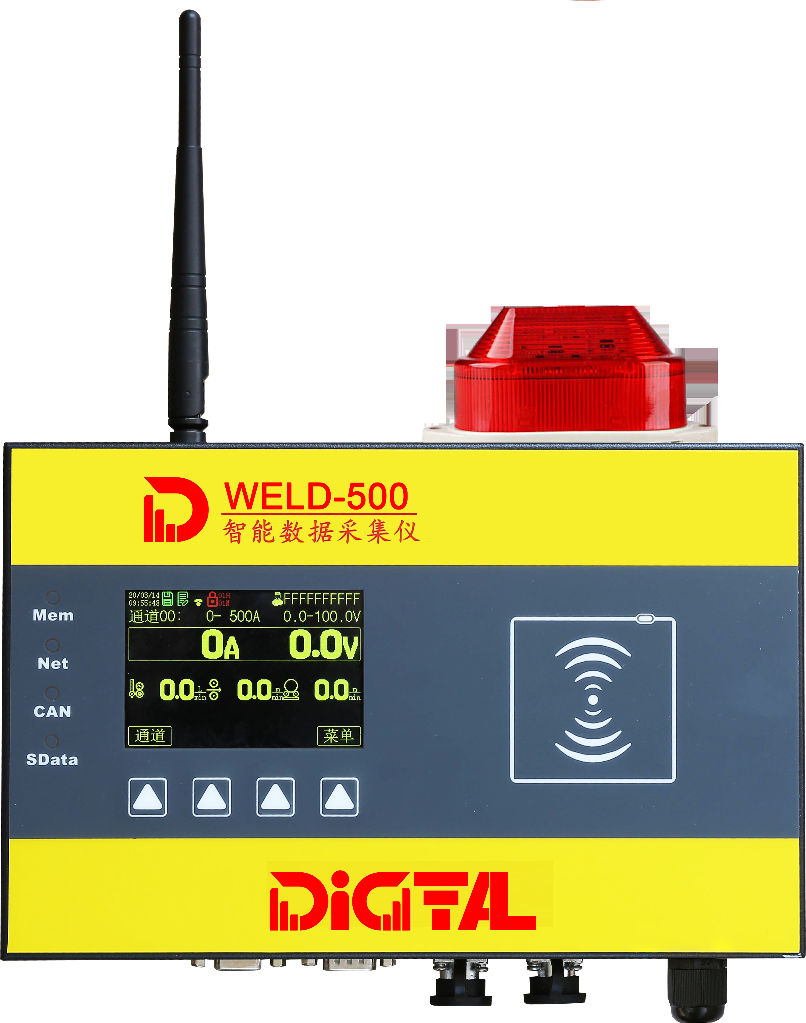 除了核心的采集功能,DA-500 在易用性与安全性上也颇具亮点:配备 3.5 寸 LCD 显示器,焊接电压、电流、采集状态等参数一目了然,操作人员无需专业培训即可快速查看;自带 13.56MHz RFID 读卡器,可实现人员、设备的快速关联,便于责任追溯;同时具备光报警器,当焊接参数超出预设范围时,能及时发出报警提示,帮助操作人员第一时间调整工艺,避免不合格焊缝产生。此外,其金属外壳设计不仅坚固耐用,还能适应车间复杂的粉尘、油污环境,且体积小巧、安装简便,可灵活部署在不同焊接工位。